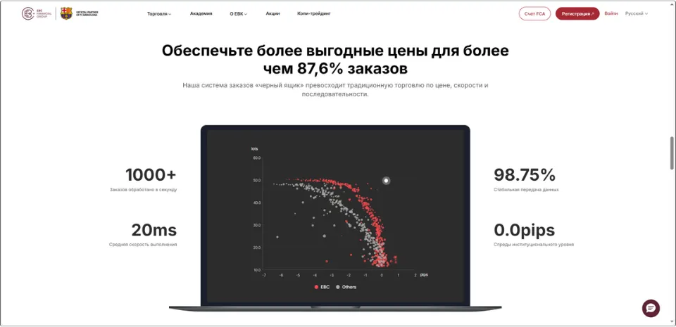 EBC размещает серверы в LD4 в Лондоне с прямым оптоволоконным соединением. Средняя скорость исполнения ордеров около 20 мс идеальна для алгоритмической торговли (EA) и высокочастотных стратегий.2. Механизм предотвращения расширения спредов на основе глубокой ликвидности