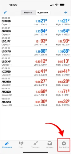 Откройте приложение MT4 и коснитесь значка «Настройки» в правом нижнем углу, чтобы войти в главное меню настроек.