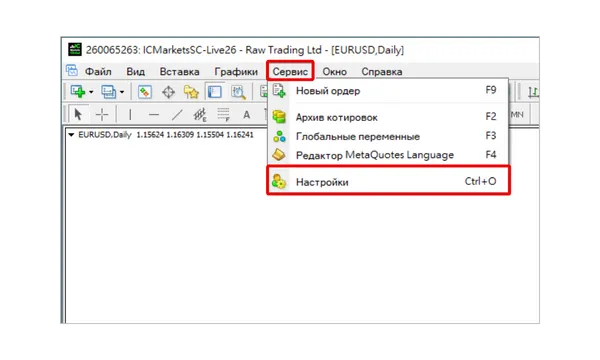 Сначала в верхней строке меню вашей программы MT4 нажмите «Сервис», а затем в раскрывающемся меню выберите «Настройки».