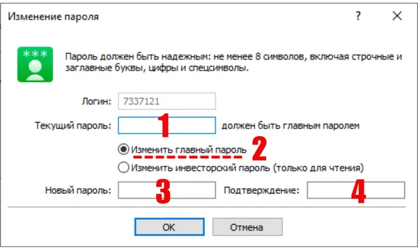 A2: Нет. Главный пароль и инвесторский пароль независимы. Смена главного пароля не повлияет ни на какой инвесторский пароль, который вы установили ранее.Q3: Почему ничего не произошло или появилась ошибка после того, как я нажал «OK»?