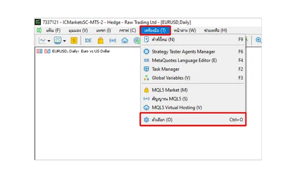 เปิดโปรแกรม MT5 ของคุณ คลิกที่ "เครื่องมือ (T)" บนแถบเครื่องมือด้านบน จากนั้นเลือก "ตัวเลือก (O)" จากเมนูแบบเลื่อนลง