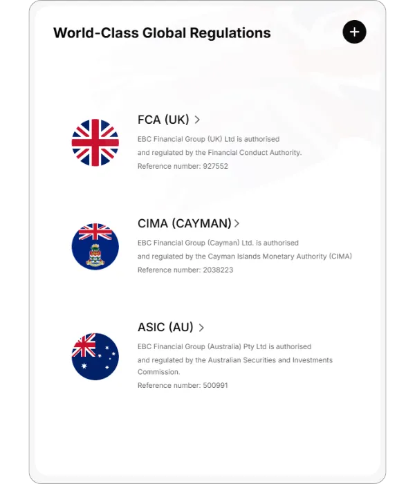 Для обслуговування міжнародних трейдерів, які шукають високу ефективність капіталу, EBC надає послуги через організації на Сент-Вінсенті (SVG) та Кайманових островах (CIMA) (Cayman Reference No: 2038223). Це дозволяє групі пропонувати конкурентне кредитне плече (до 1:500) та гнучкі послуги копі-трейдингу в рамках дотримання вимог.