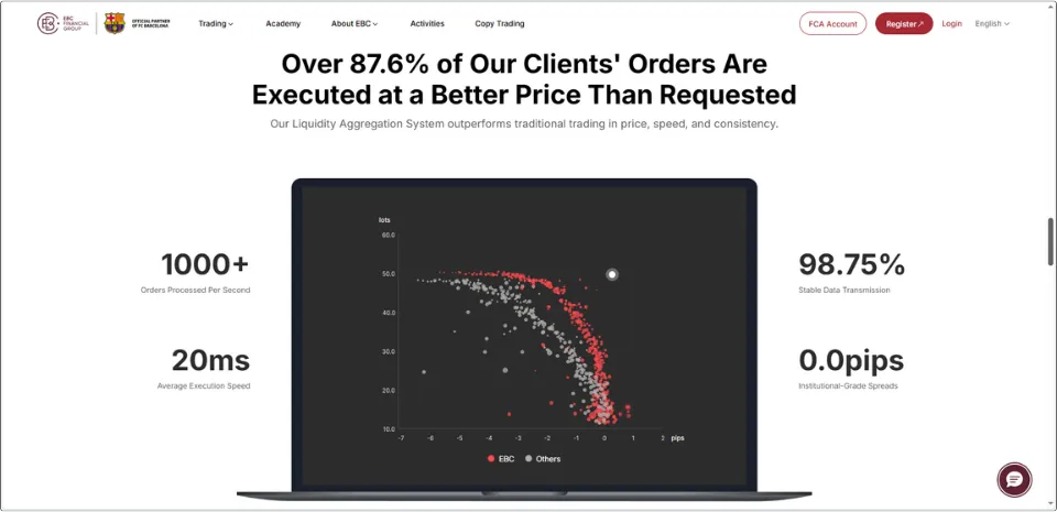 Дані про ліквідність у реальному часі, офіційно опубліковані EBC. Цей графік підтверджує переваги «Захисту від розширення» та «Позитивного прослизання», при цьому до 87,6% ордерів виконуються за цінами кращими за очікувані, що пояснюється потужною системою агрегації ліквідності вищого рівня.