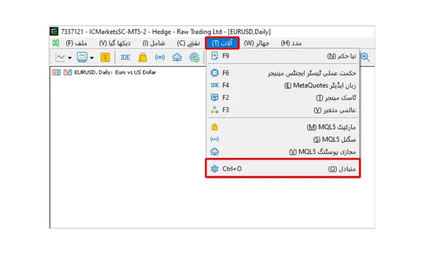اپنا MT5 پروگرام کھولیں، اوپری ٹول بار پر "آلات (T)" پر کلک کریں، اور پھر ڈراپ ڈاؤن مینو سے "متبادل (O)" منتخب کریں۔