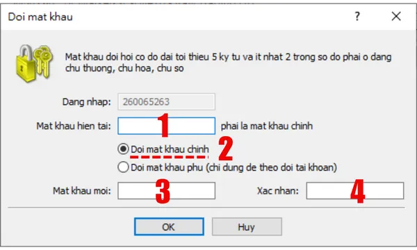 Đây là bước quan trọng nhất. Trong cửa sổ "Thay đổi mật khẩu" bật lên, vui lòng hoàn thành các thao tác sau theo thứ tự:- Mật khẩu hiện tại: Nhập "Mật khẩu chính" cũ mà bạn đang sử dụng.