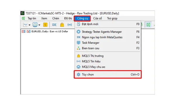 Mở nền tảng MT5 của bạn, nhấp vào "Công cụ" trên thanh công cụ trên cùng, sau đó chọn "Tùy chọn" từ menu thả xuống.