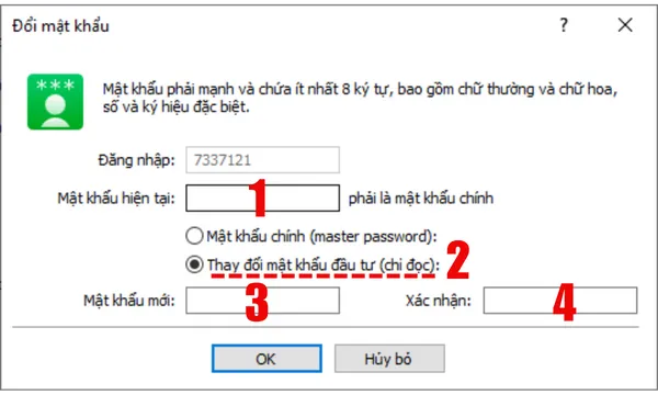 Đây là bước quan trọng nhất. Trong cửa sổ "Đổi mật khẩu", vui lòng hoàn thành các thao tác sau theo thứ tự:- Mật khẩu hiện tại: Vui lòng nhập "Mật khẩu chính" của bạn (mật khẩu có toàn quyền).